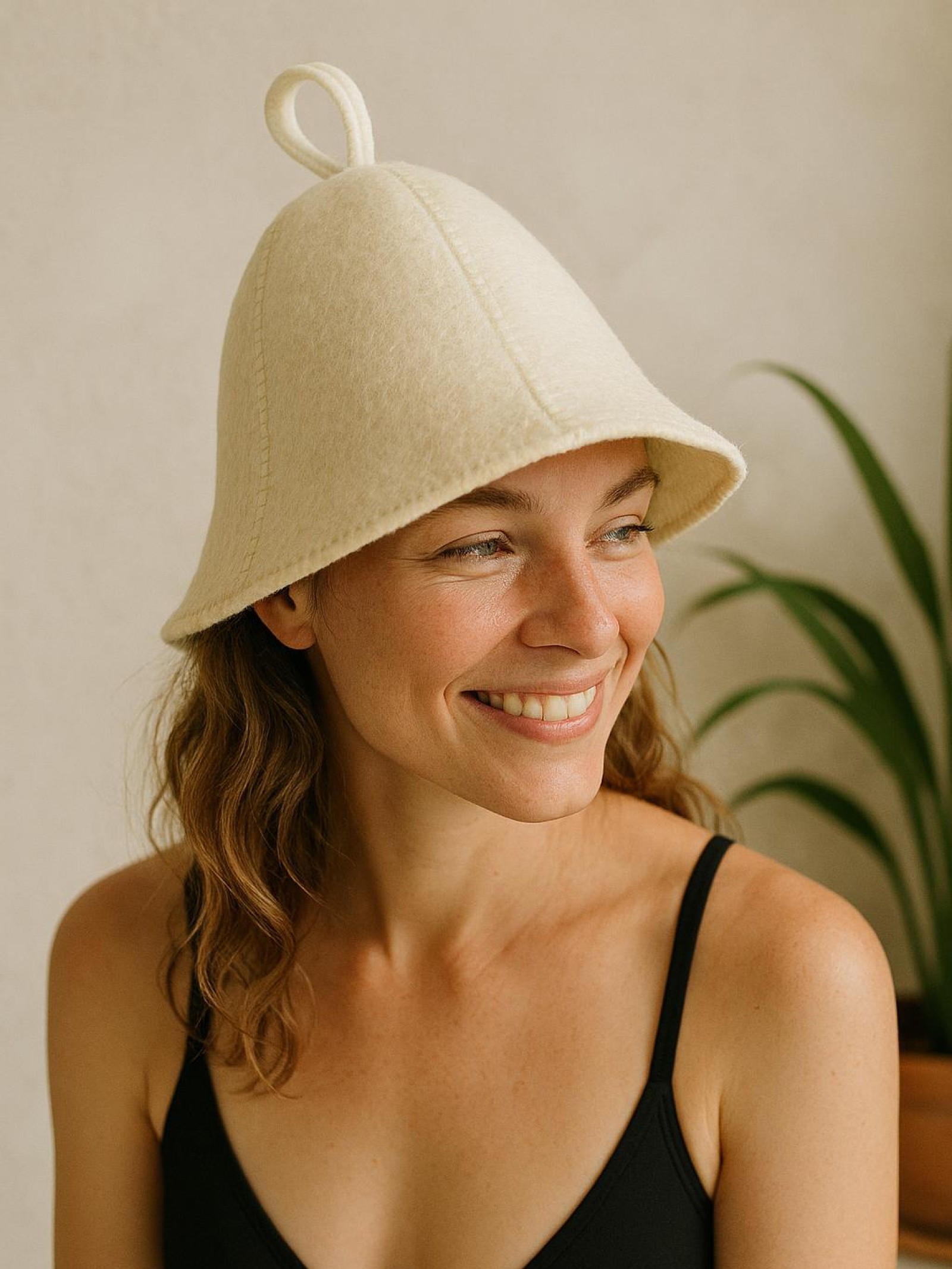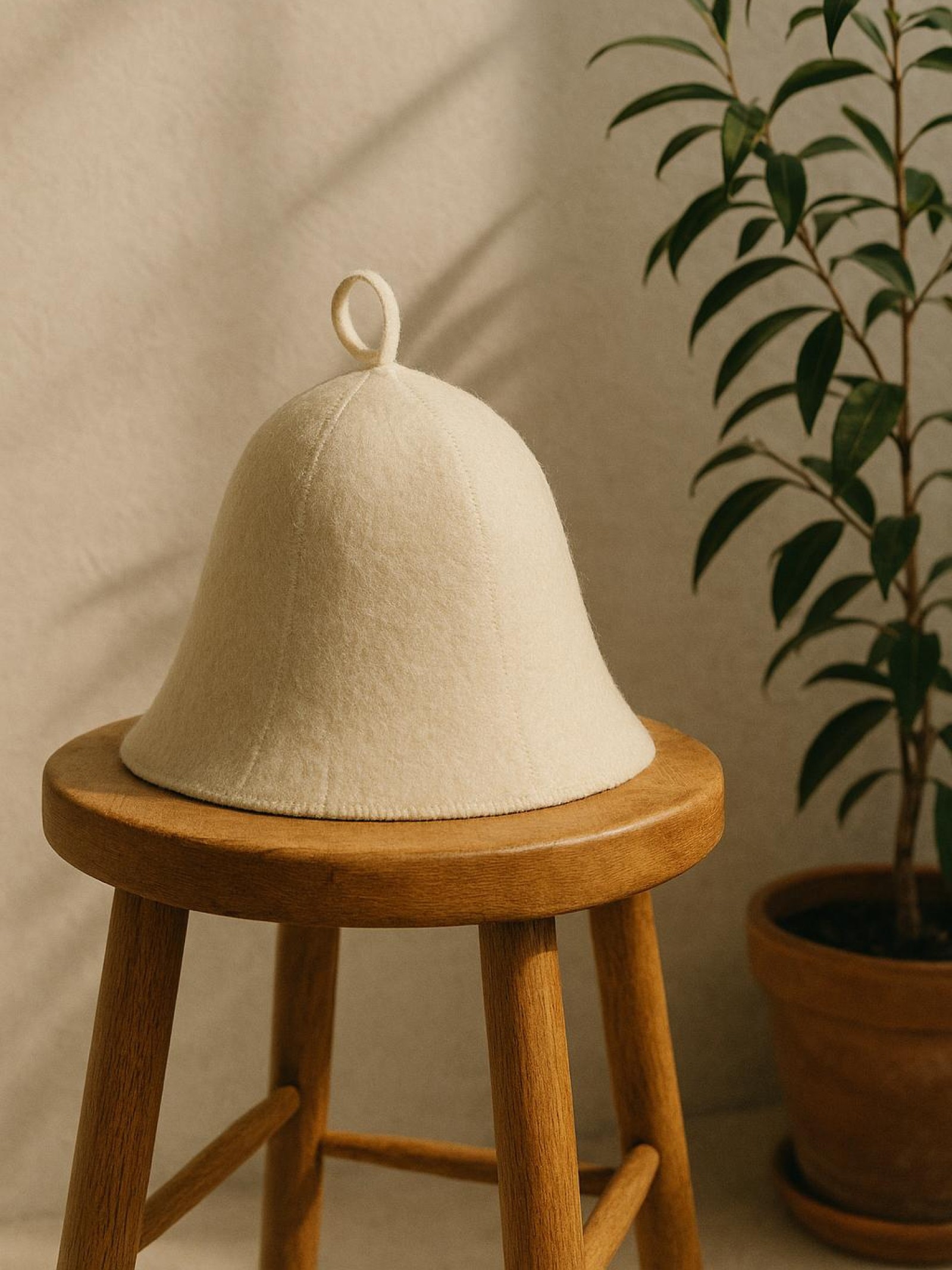 A woollen hat, crafted entirely from natural fibres, intended for use in sauna environments. Its primary function is to assist in moderating temperature fluctuations, shielding the head from excessive heat while preserving comfort. The material offers insulation without undue weight. Simple, unembellished, and designed to complement the ritual of sauna bathing with quiet utility.